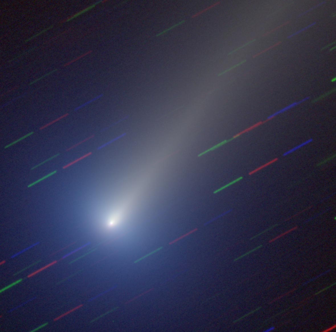 通过叠加90张5秒/张长的图像,该彗星被显示为呼啸而过的背景恒星,这些恒星在这里显示为从绿色到红色到蓝色的彩色条纹--选择这些颜色是为了表示用于观测Leonard三种不同的过滤器。
