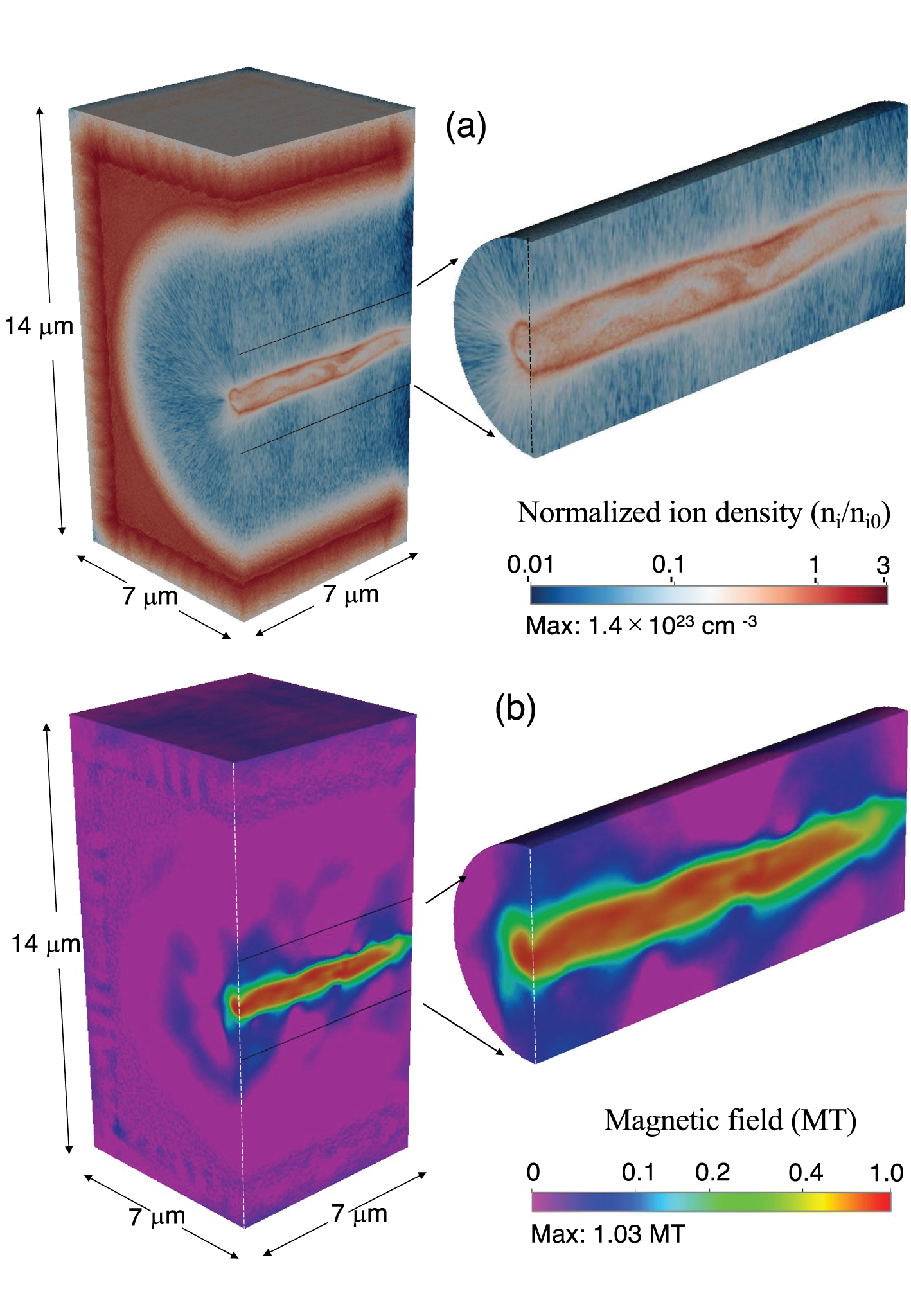 t~200 fs 观察到的归一化离子密度和磁场分量透视图(3D EPOCH 模拟结果)