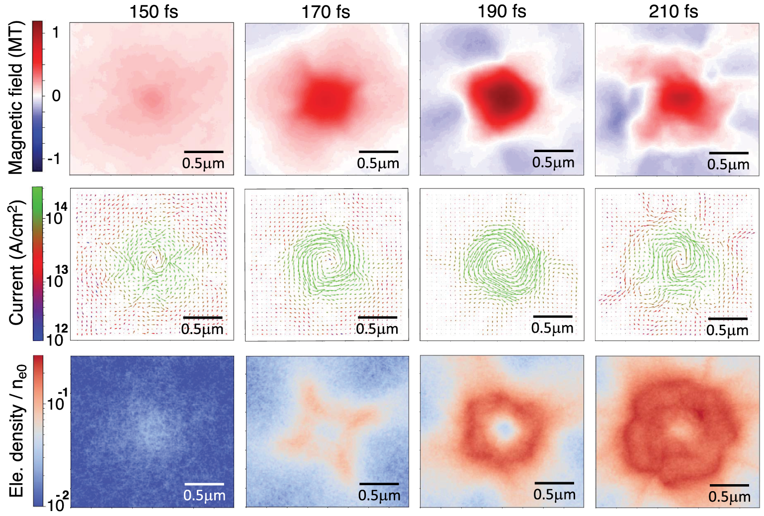 而围绕中心轴集体运动的带电粒子,又可产生拍安培/平方厘米(peta-ampere/c㎡)级别的强自旋电流,最终在几十纳米的范围内产生了兆级(MT)的磁场。