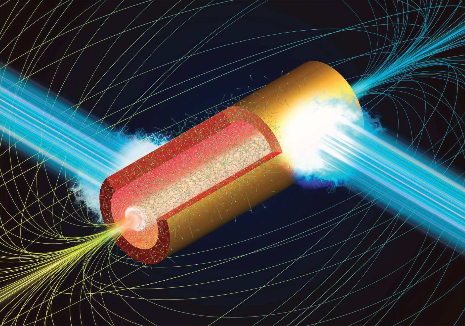 上图展示了由激光产生的具有兆级电子伏特能量的热电子和内壁表面的冷离子(向中心轴内爆)。