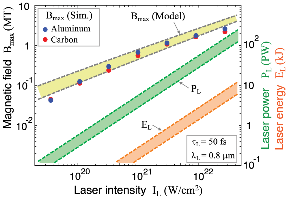 结果他们发现了一个明显的标度定律,将 MTI 产生的磁场性能和施加的激光强度、能量和目标尺寸等外部参数都关联到了一起。
