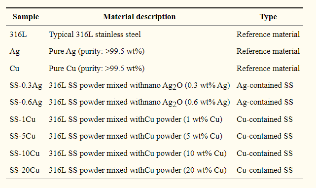 为了解决这两个局限,研究人员使用铜粉和纳米级氧化银粉末,与不锈钢粉混合,制备不同质量分数的铜-不锈钢与银-不锈钢混合物,再通过烧结形成盘装固体。同时,以纯铜、纯银、纯不锈钢作为实验的对照组。