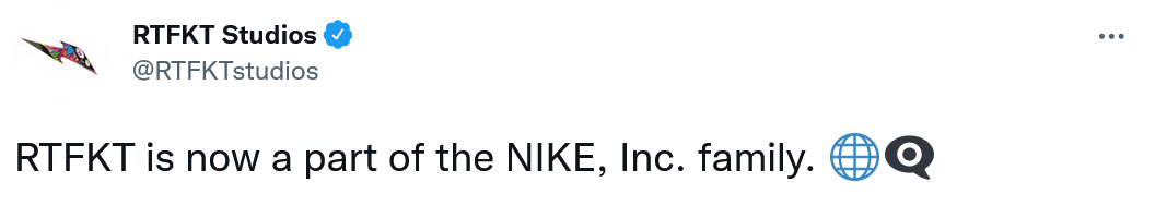 在宣布这项交易时--但没有透露交易的价格-耐克将RTFKT的闪电式标志跟它自己标志性swoosh、Jumpman和Converse标志放在了一起。据悉,这些品牌有几十年的历史,建立在高水平的运动代言人、独特的设计和实际存在于现实世界的草根文化上。而RTFKT则只是一家在2020年1月成立的公司。耐克指出:“人类在意识方面的发展速度比预期的要快。我们现在就来加速我们的数字未来。”