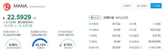 虽然元宇宙概念被大众广为人知还没几个月的时间,但以Decentraland平台为例,它的出现已经有4年的时间,而且平台里用以交易的货币MANA也已经从0.05元涨到了37.99元,价格翻了760倍。