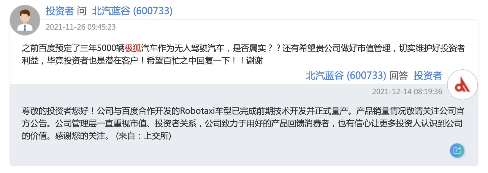 近日,北汽蓝谷在回答投资者问题时表示,公司与百度合作开发的Robotaxi车型已完成前期技术开发并正式量产,产品销量情况敬请关注公司官方公告。今年6月17日,ARCFOX极狐和百度联合发布了全新量产共享无人车Apollo Moon。