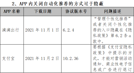 存在的主要问题为:App未向用户提供关闭自动化推荐的方式,涉及的App为曹操出行、翼支付和禾适外卖,App内关闭自动化推荐的方式过于隐蔽,涉及的App为滴滴出行和支付宝。