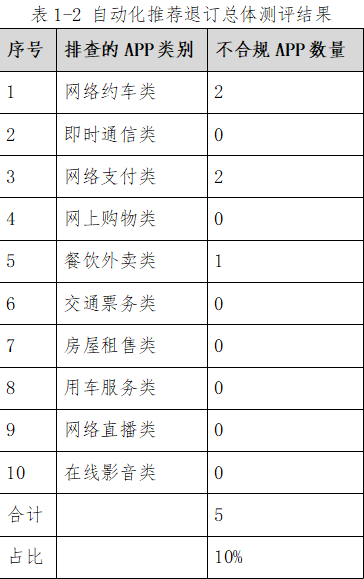 在自动化推荐退订方面,50款App中有5款App存在不同程度问题,占总排查比例的10%。