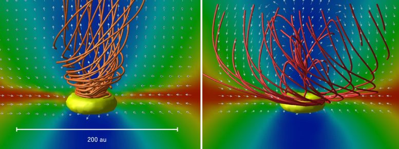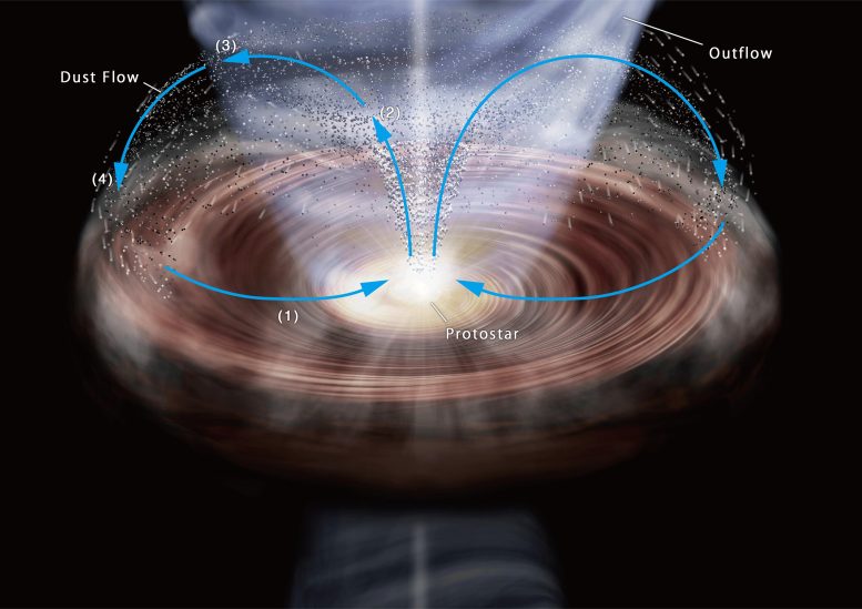 世界上第一个同时考虑年轻恒星周围圆盘中尘埃运动和增长的三维模拟显示,中心区域的大型尘埃可以被气体外流夹带,然后被喷射出来,并最终落回圆盘的外部区域,在那里它可能促成行星的形成。这个过程可以比作火山的 “落灰”,即在火山爆发期间被气体带起的灰落在火山周围的区域。这些结果有助于解释观察到的年轻原恒星周围的尘埃结构。
