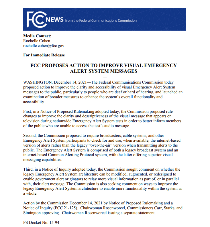 传统版本的紧急警报在电视上播出,有一个测试模式的屏幕和一个响亮的警报噪音,然后是口头指示。FCC说,它希望广播公司、有线电视系统和紧急警报系统(EAS)的其他参与者尽可能使用基于互联网的通用警报协议版本的警报。对于电视警报,FCC希望看到在EAS测试中出现在电视上的视觉图像的“清晰度和描述性”得到改善,以帮助那些无法听到测试音频信息的人。