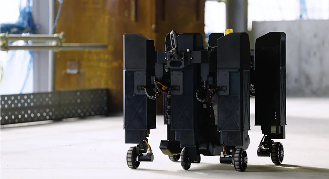 索尼研发中心正在开发的移动机器人正在实际施工现场投入使用,该施工现场具有水平差异、开口障碍物和其他障碍物,以评估其性能并验证该技术。该机器人的地面接触部分具有六条腿的轮子配置,由六个装有轮子驱动器的腿部结构组成。该机器人在平地上使用轮子,而在有高度差异的地方,如楼梯,则使用轮子和腿来上下移动。