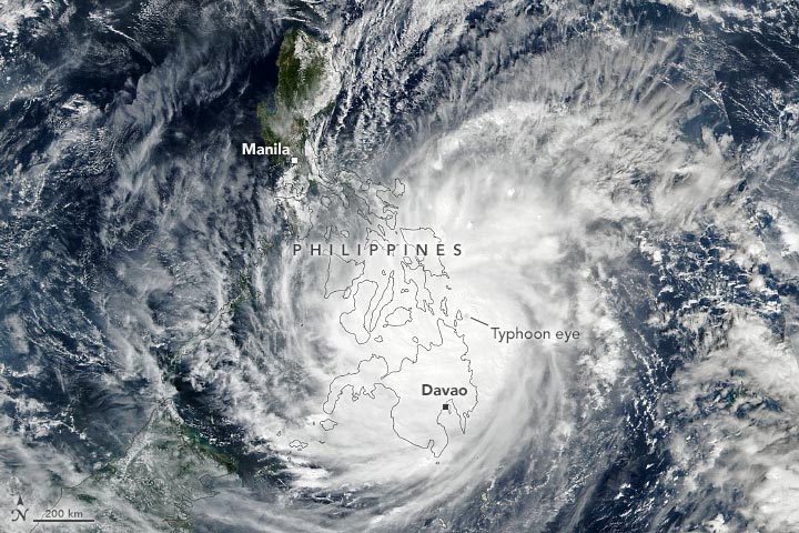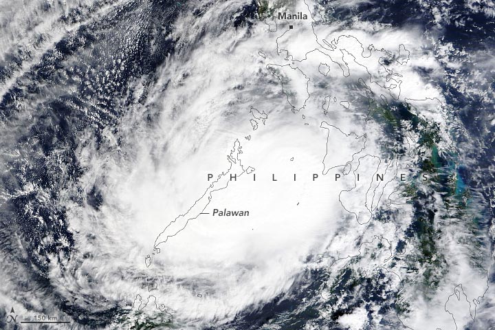 这张台风“雷伊”的自然色图像是由Suomi-NPP卫星上的可见光红外成像辐射套件(VIIRS)在2021年12月16日下午早期获取的。在这张图片的前后,该风暴的持续风速为每小时240公里(150英里),属于超强台风。