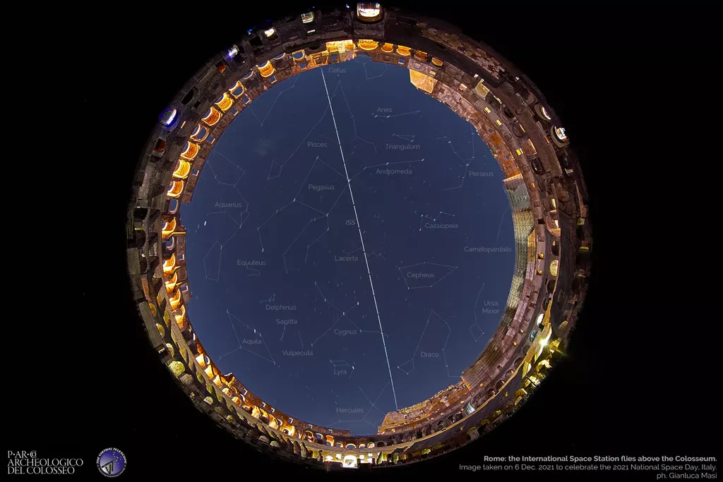 负责 Virtual Telescope 项目的天体物理学家 Gianluca Masi 与罗马斗兽场考古公园(Parco archeologico del Colosseo)合作,于 12 月 6 日拍摄了国际空间站飞越斗兽场的画面。这张图片是一个狂野的向上视角,历史悠久的圆形剧场的墙壁出现在一个圆圈中,国际空间站被看作是夜空中的一束光。