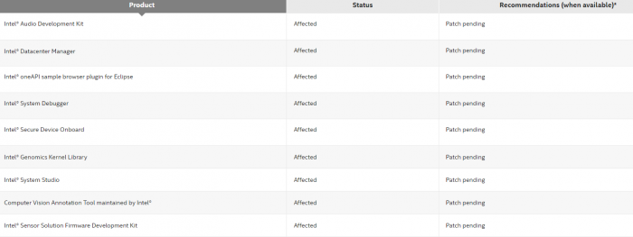 Intel那边受到影响较多,包括Audio Development Kit、Datacenter Manager等9款产品,坏消息是目前还没有补丁修复,Intel还在准备中,得等等才行。