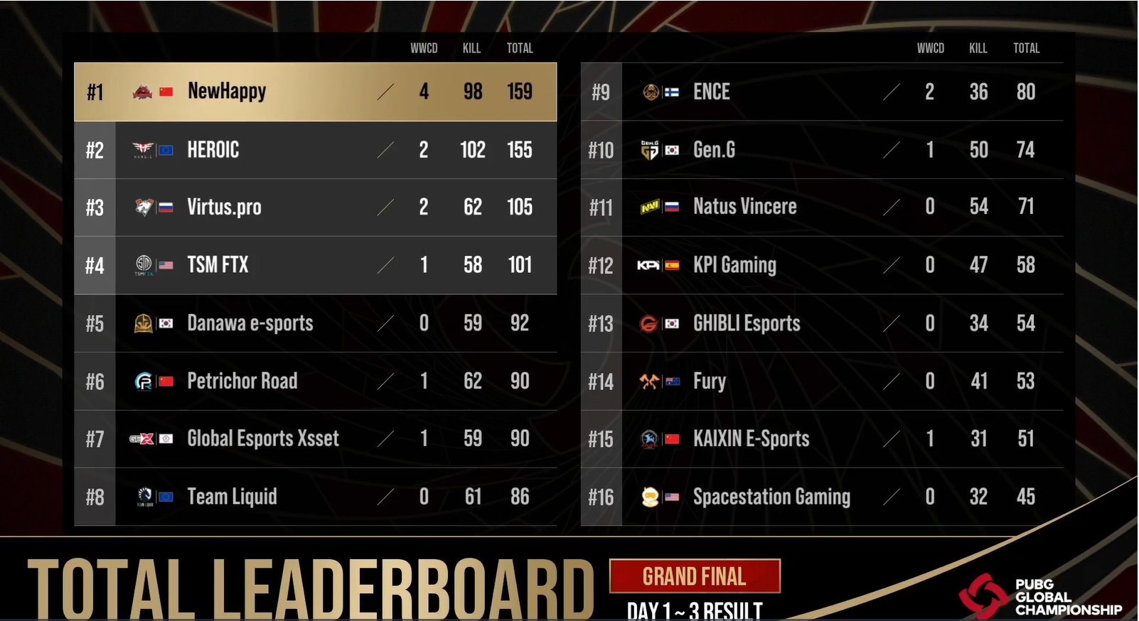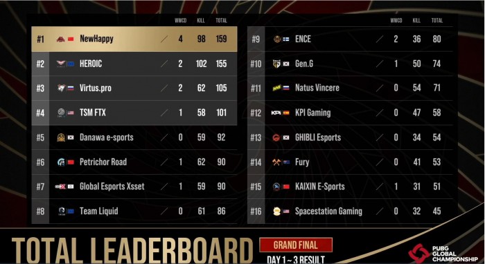 12月19日晚进行的2021 PGC全球总决赛中,来自PCL赛区的中国战队“NewHappy”夺得世界冠军!这是OMG 2018夺冠足足1238天之后,中国战队再次拿下世界第一。NewHappy战队在本次总决赛的发挥堪称完美,单日豪取63分,最终以4分的优势反超夺冠,最终得分为159分,高居第一。