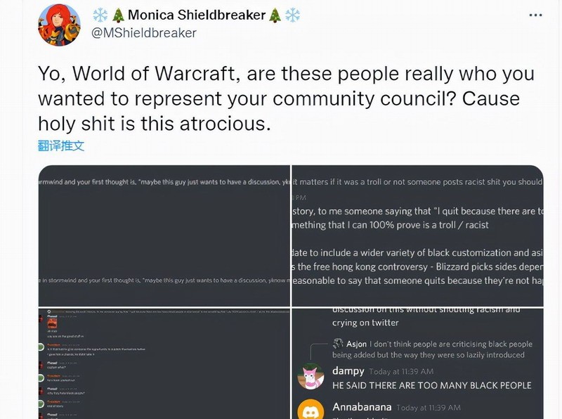 动视暴雪最近深陷舆论风暴中,现在暴雪旗下游戏都在小心翼翼避免敏感内容,努力迎合大众。但近日《魔兽世界》一个非官方社区委员会Discord服务器又炸开锅了,许多人都在抱怨暴雪将《魔兽世界》NPC变为有色人种,有人表示“暴风城中黑人太多了”。