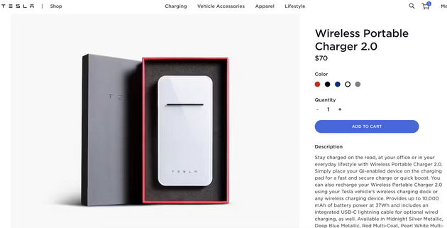 12月21日下午消息,特斯拉官网上架无线充电宝2.0,售价70美元(约合人民币446元)。据官网描述,该无线充电宝配有红、黑、蓝、白、灰5种颜色,对应特斯拉5种车漆颜色;容量为10000毫安,支持所有Qi协议的设备无线充电,也可以通过Type-C接口有线充电。