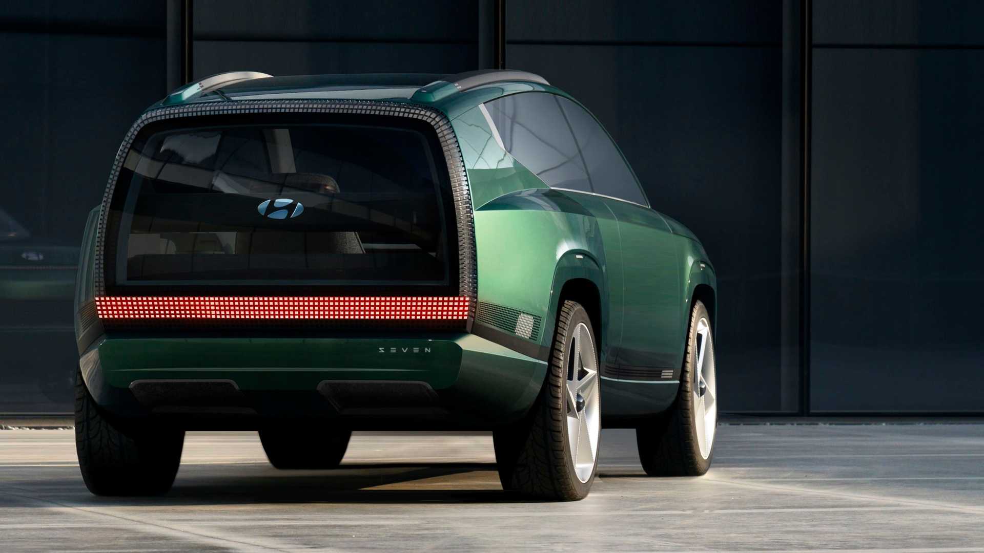 从这张渲染效果图来看,设计师希望现代IONIQ 7能够保留概念车上的大部分前脸造型元素,比如很像机械战警头部的贯穿灯带和封闭式前脸设计,以及下方两条竖置灯带和中间阵列式的“显示屏”,另外概念车的车身线条以及涡轮风扇造型的轮圈也被设计师沿用到了IONIQ 7身上。