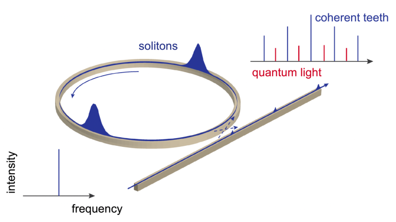 接下来的步骤涉及到能够检测到光的单一粒子的设备,并将微环与几个孤子“打包”,形成一个孤子晶体。“有了孤子晶体,你可以看到在齿间实际上有更小的光脉冲,这就是我们测量推断纠缠结构的东西,”Guidry解释说。“如果你把探测器停在那里,你可以很好地观察有趣的量子行为,而不会被构成齿的相干光所淹没。”