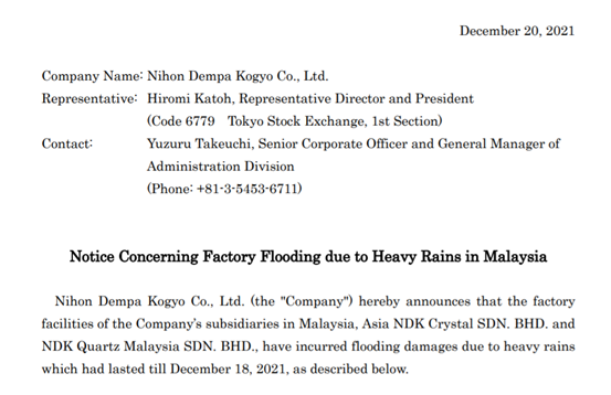 12月22日,因马来西亚近期持续性暴雨,导致全球石英组件大厂日本电波工业(Nihon Dempa Kogyo,NDK)位于当地的2座厂房淹水停工,且预估复工还需要一段时间。12月20日,NDK发布关于马来西亚暴雨导致工厂遭受洪灾的通知称,因马来西亚持续性的暴雨,截至12月18日为止导致旗下位于雪兰莪的2座工厂淹水停工。