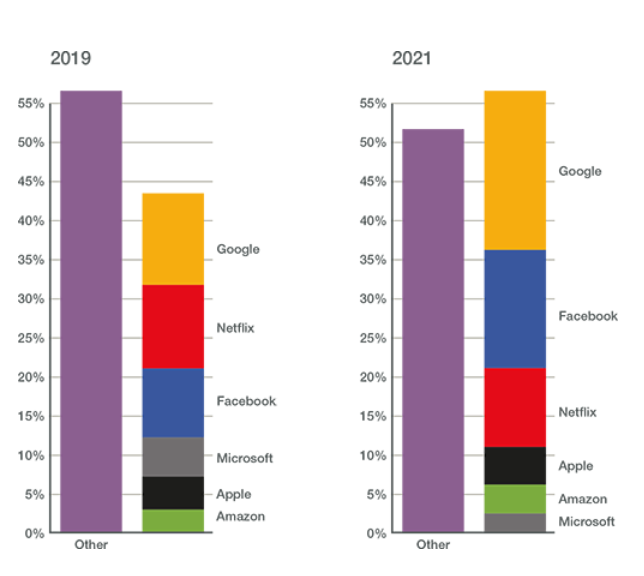 图:全球Top互联网公司的网络流量在新冠疫情期间占据一半以上。来源:Sandvine。