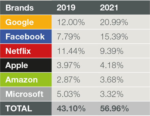 网络监控公司Sandvine首席战略官Samir Marwaha在一篇最新的博客文章中写到,该公司即将发布的2022年“全球互联网现象报告”发现,2021年,全球Top 6互联网和科技公司——Google、Facebook、Netflix、亚马逊、微软和苹果产生了超过56%的全球网络流量,他们在2021年产生的流量占比超过了所有其他互联网公司的总和。