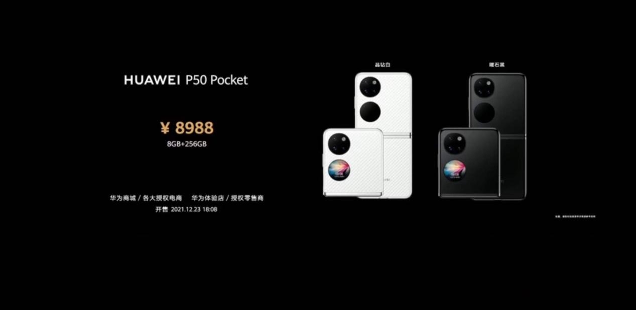 价格方面,华为P50 Pocket晶钻白、曜石黑 8GB+256GB 售价为8988元,艺术定制版(鎏光金)12GB+512GB 售价为10988元,将于今日18:08正式开售。