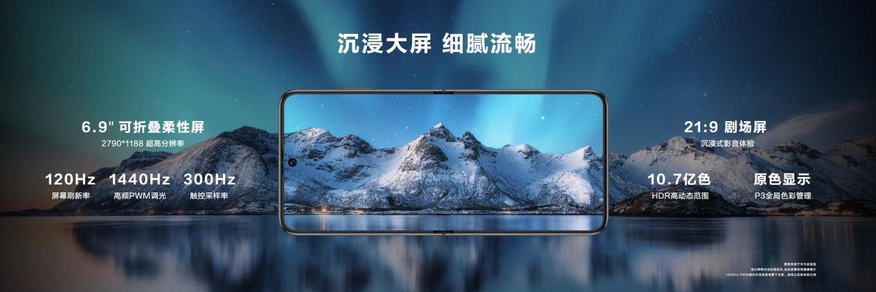 华为P50 Pocket采用了一块6.9英寸的可折叠显示屏,四边基本等宽,屏幕比例为21:9,与影院常用的大片比例完全相同,在观看电影时可以做到完全无黑边的沉浸式体验。