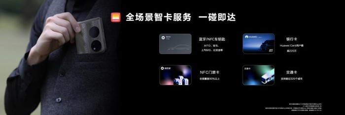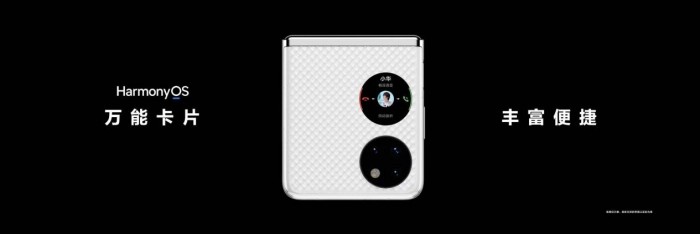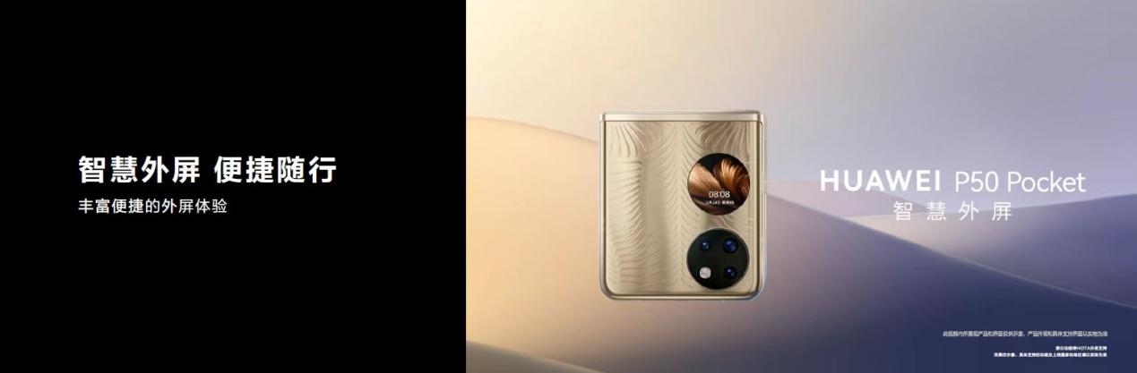 该机还继承了此前P50系列的双环设计,有意思的是这次只有上方的圆环是镜头模组,下方的圆环则是一块小尺寸外屏,能显示即使的通知、时间等信息,无需开盖就可阅读,并且还支持丰富的第三方服务,并且还能与内部大屏进行无缝连接流转。