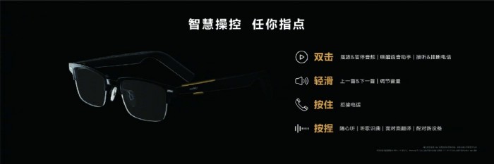 交互方面,支持张开镜腿自动发现附近手机/平板/PC等蓝牙设备自动配对,支持超级终端音频流转、镜腿带有电容触摸按键进行手势控制等。
