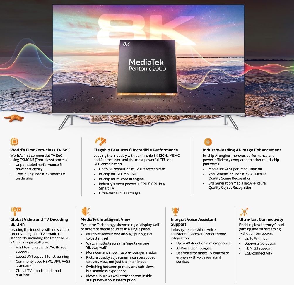 除了在电视领域保持领先的 CPU / GPU 规格,Pentonic 2000 还支持 UFS 3.1 存储、以及通过分屏来充分利用 8K 屏幕。