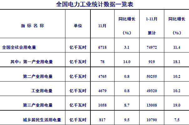 截至11月底,全国发电装机容量约23.2亿千瓦,同比增长9.0%。其中,水电、风电、太阳能发电装机分别达到3.88亿千瓦、3.05亿千瓦和2.87亿千瓦,均持续保持世界第一。