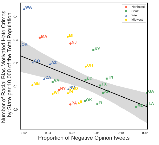 “停止亚裔仇恨”运动的反对声音更多地出现在仇恨犯罪更少的州。图一展示了反对声音Twitter占比与种族偏见动机型仇恨犯罪数量占比的关系。根据所在州的地理位置,本文用不同颜色标示。州按地理位置分为四大类:东北、南部、西部以及中西部。