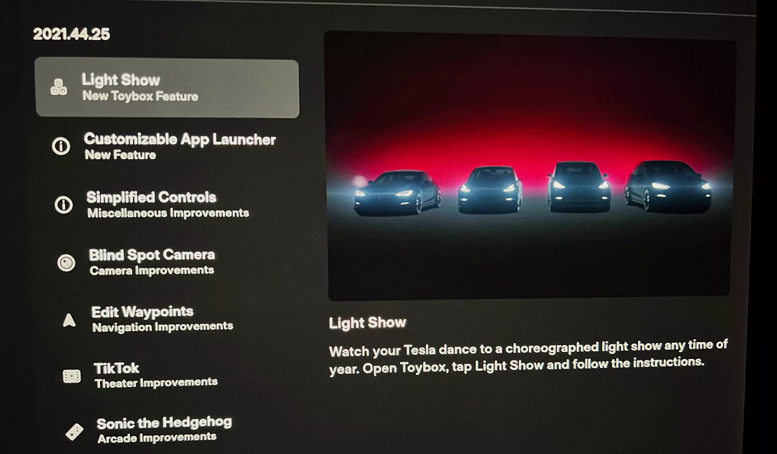 除此之外还有一项新功能可供所有人使用--甚至那些甚至不拥有特斯拉的人,它就是对Tesla Light Show(特斯拉灯光秀)的更新。这个功能实际上人们过去曾见过,它能让特斯拉音频系统在播放节日热门音乐如《糖梅仙子之舞(胡桃夹子组曲)》的同时让灯光秀与之搭配起来。现在,特斯拉开放了支持XLights的功能,这是一个开源的免费软件,其允许用户在电脑上创建自己的车辆灯光秀。然后,该文件可以使用USB驱动器上传到兼容的特斯拉汽车上。