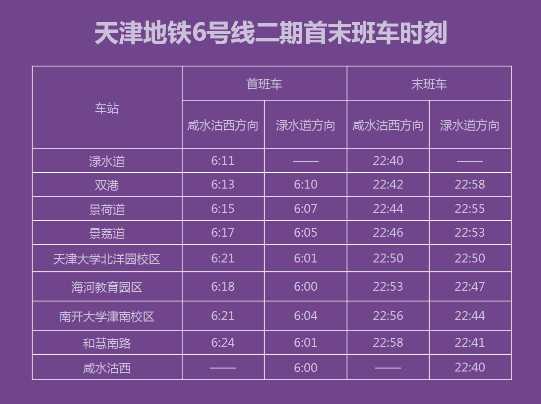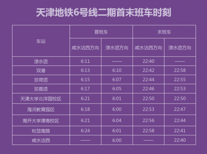 6号线二期运营时间为6:00—23:01 ,咸水沽西站首班车发车时间为6:00,渌水道站首班发车时间为6:11。渌水道站末班车发车时间22:40,终到站时间23:01,咸水沽西站末班车发车时间为22:40,终到站时间为23:01。