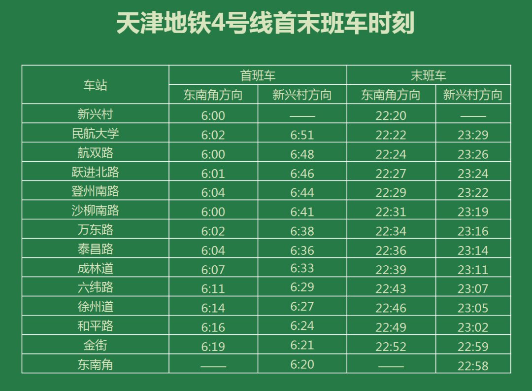 4号线南段开通初期运营后,运营时间为6:00至23:33,东南角站首班发车时间为6:20,新兴村站首班发车时间为6:00;东南角站末班车发车时间22:58,终到站时间为23:33,新兴村站末班发车时间22:20,终到站时间为22:54。