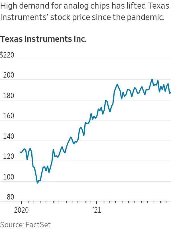 图示:全球范围内的芯片短缺问题让德州仪器股价不断上涨