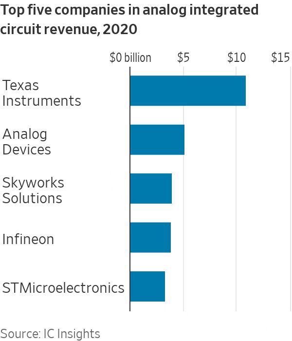 除德州仪器外,其他主要模拟芯片制造商还包括总部位于美国马萨诸塞州威尔明顿市的亚德诺半导体(Analog Devices)以及总部位于欧洲的英飞凌科技(Infineon Technologies AG)和意法半导体(STMicroelectronics NV)。