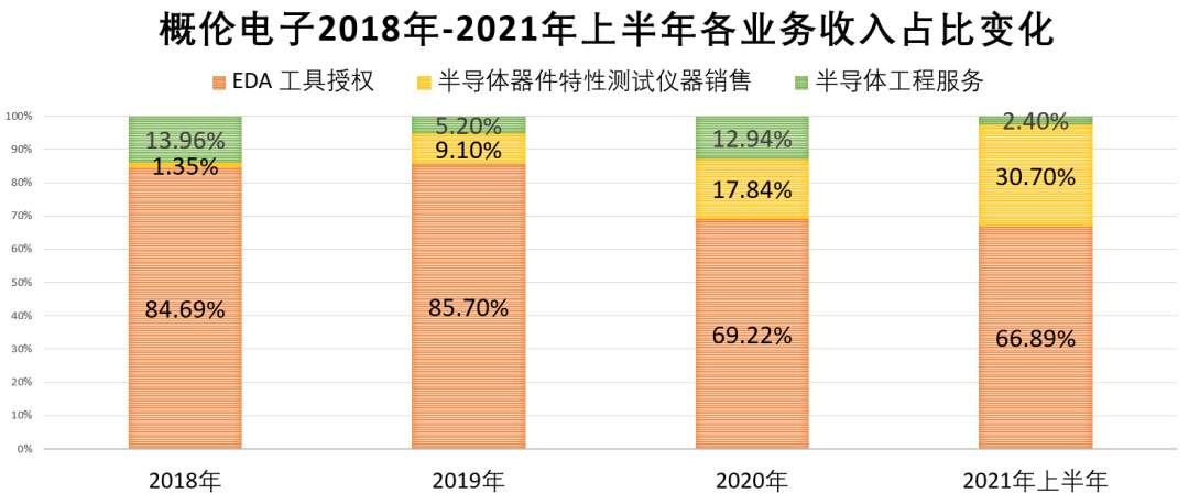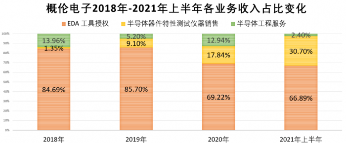 ▲ 概伦电子 2018 年-2021 年上半年各业务收入占比变化