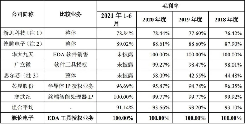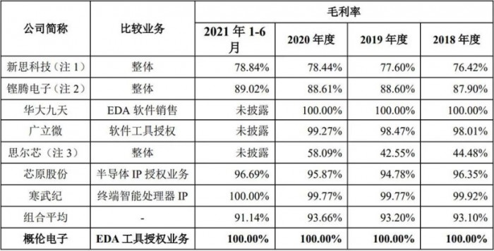 报告期内,概伦电子 EDA 工具授权业务毛利率为 100%,与华大九天、广立微、寒武纪等轻资产经营模式可比公司相似。