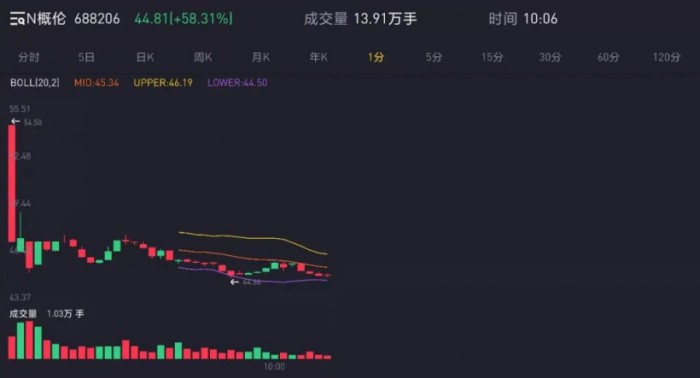 概伦电子开盘价为 55 元 / 股,股价涨幅达 66%,随后其股价维持在 46 元 / 股-44 元 / 股,最低为 44.66 元 / 股。截至芯东西 10 点 06 分成文,概伦电子股价为 44.81 元 / 股,较发行价涨幅近 58%,总市值 194 亿元。