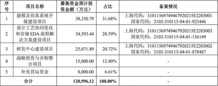 本次 IPO,概伦电子计划募资 12.10 亿元,分别用于“建模及仿真系统升级建设”、“设计工艺协同优化和存储 EDA 流程解决方案建设”、“研发中心建设”、“战略投资与并购整合”和“补充营运资金”5 个项目。