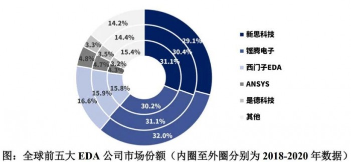 当前 Synopsys(新思科技)、Cadence(楷登电子)、西门子 EDA 三大巨头确立了行业垄断地位,赛迪顾问的数据显示,2020 年三大 EDA 巨头的全球市场占有率超过 77%。这三大巨头通过不断地拓展、兼并和收购已形成全流程解决方案,并建立了相当完善的生态。