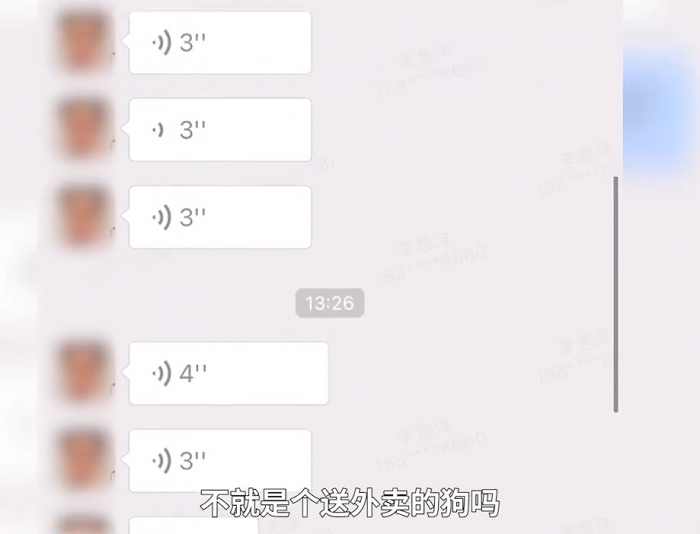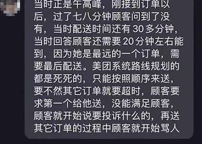 但是该女生又催了两次,要去优先给她配送,无法满足的情况下声称要投诉,然后开始骂人:“脑子里全是豆腐渣”“不就是个送外卖的狗吗”“这辈子就只配送外卖”“死在你爹怀里”“你妈生你的时候怕是把脑子给挖了”……(视频)