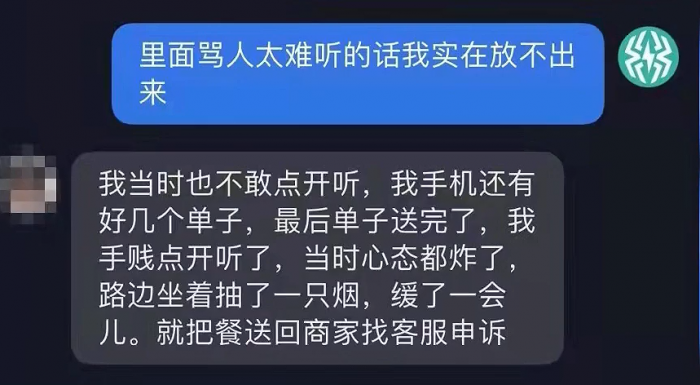 小虎表示,当时正在派送路上,不敢点开听,直到最后一个单子送完了才听到,当时心态都炸了,路边坐着抽了一支烟,缓了一会儿,然后选择了取消订单,将餐食送回商家,找客服申诉。