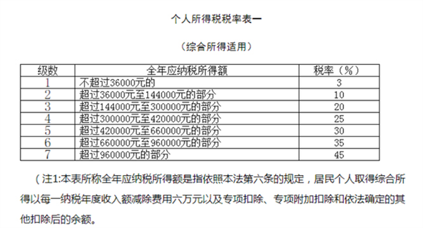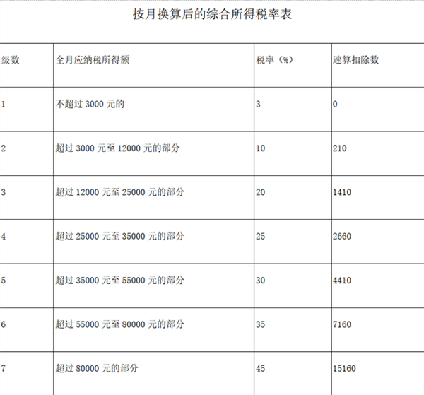 按照先行年终奖减税优惠政策,即把年终奖收入除以12个月,得到的数额按照月度税率表(详见下图),来确定适用税率和速算扣除数,单独计算纳税。