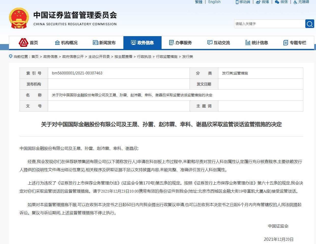 因联想科创板IPO保荐未尽责,中金公司及5名责任人被证监会监管谈话。证监会网站29日公布《关于对中国国际金融股份有限公司及王晟、孙雷、赵沛霖、幸科、谢晶欣采取监管谈话监管措施的决定》(简称《决定》)。