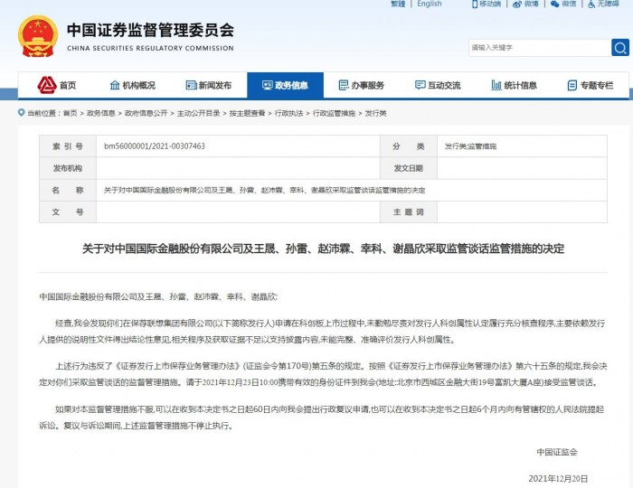 《决定》显示,上述行为违反了《证券发行上市保荐业务管理办法》(证监会令第170号)第五条的规定。按照《证券发行上市保荐业务管理办法》第六十五条的规定,证监会于2021年12月20日决定对中金公司及王晟、孙雷、赵沛霖、幸科、谢晶欣采取监管谈话的监督管理措施。