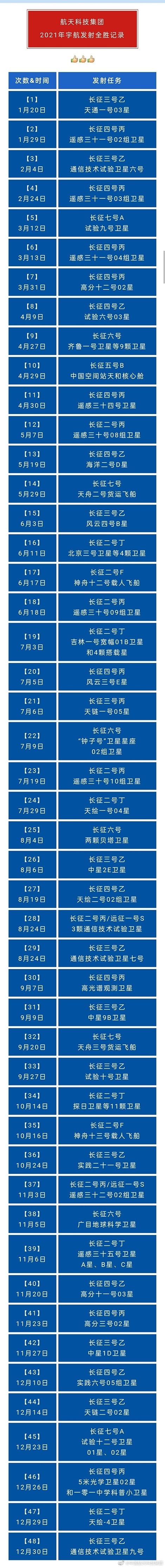 根据统计,2021年,全球共进行了144次航天发射,打破了1967年创下的139次发射纪录。其中,中国进行了55次发射,发射次数世界第一,同时也创造了中国航天发射次数的新纪录。