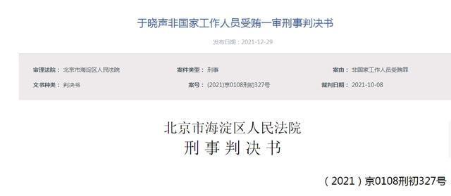 根据北京市海淀区人民法院刑事判决书显示,滴滴于晓声犯非国家工作人员受贿罪,判处有期徒刑五年,罚金人民币五十万元,并向于某某追缴违法所得人民币一百四十五万七千四百元,予以没收。