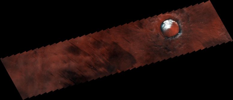 周围的大部分地形是无冰的,但已经被持续的风化过程所塑造。图片右下方的条纹是由风形成的,风将表面较亮的氧化铁粉尘吹走,暴露出稍暗的底层基质。